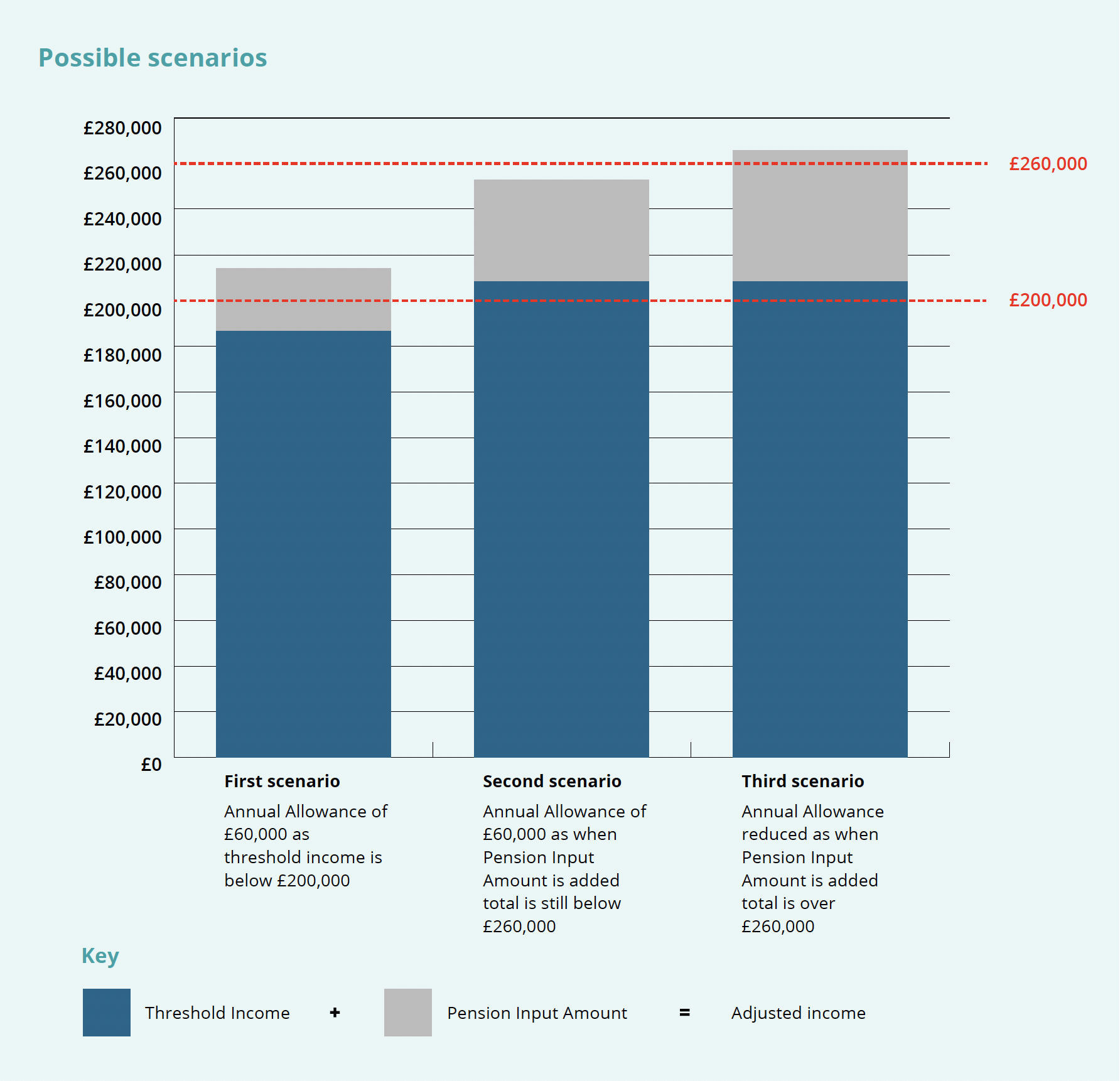 If your Threshold Income is over £200,000, then the level of your Adjusted Income will determine what your Annual Allowance is. Your Adjusted Income is broadly your Threshold Income, plus the total value of your Pension Input Amount (aggregated across all your pension arrangements).
