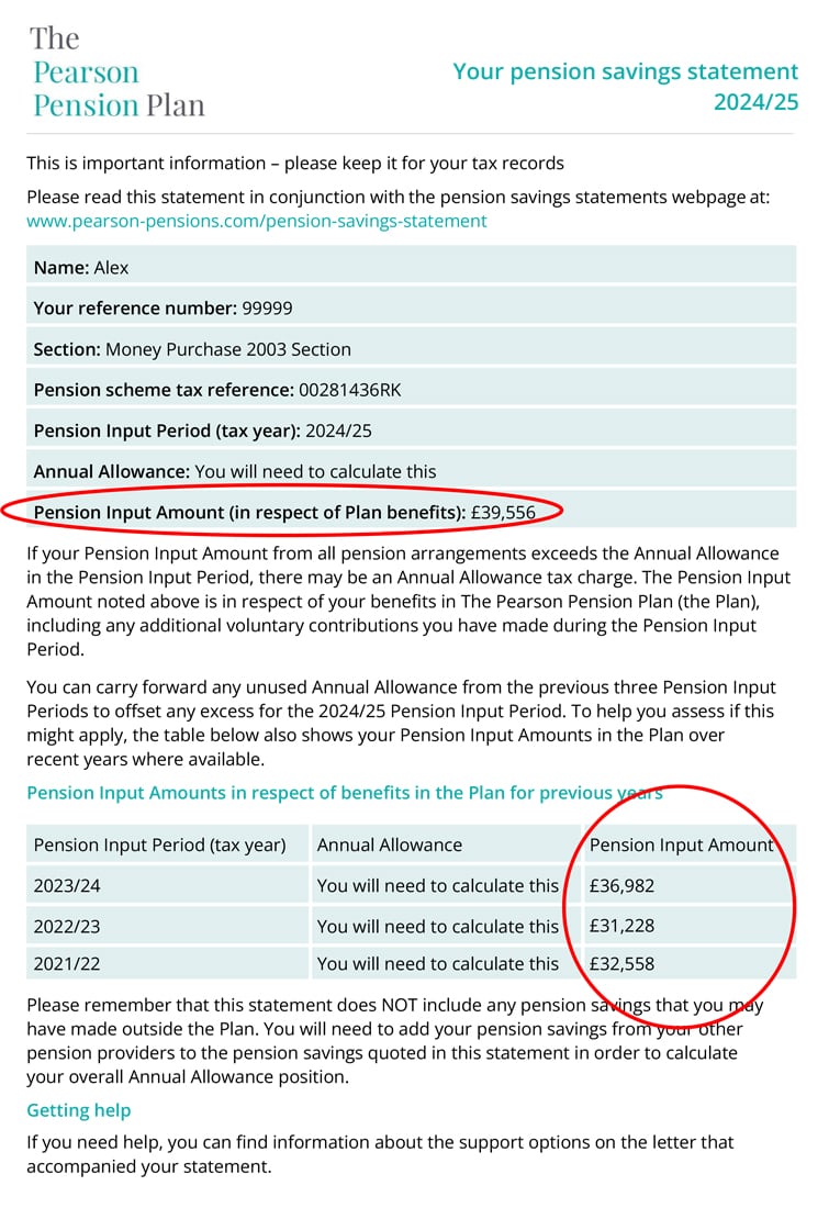 You can find your Pearson Pension Plan Pension Input Amount for the last complete tax year, and each of the three previous years, in your pension savings statement.